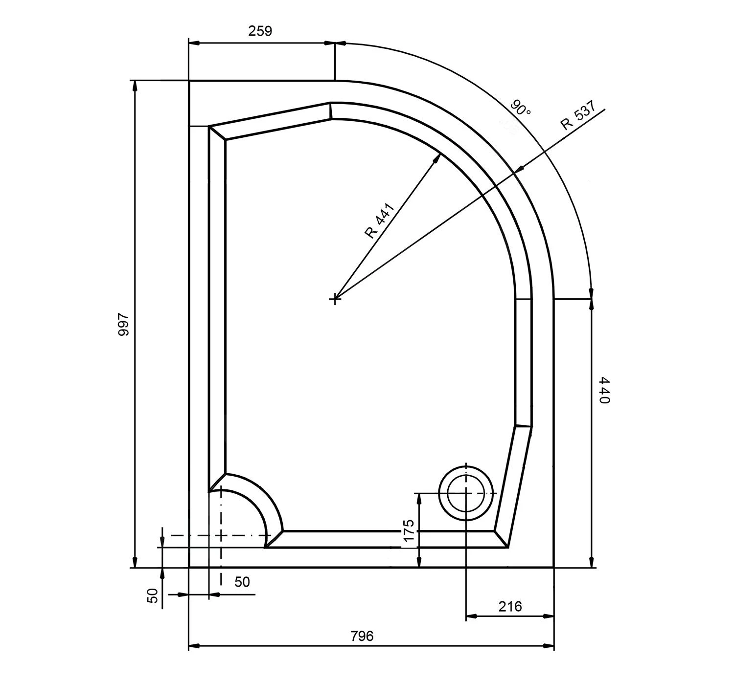 Kwartronde douchebak van gegoten marmer, R550