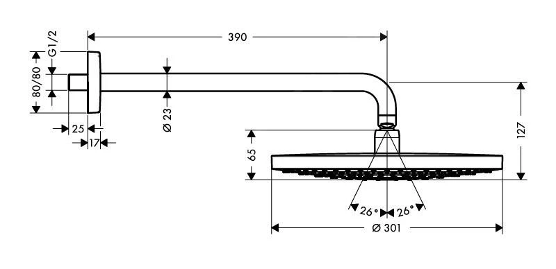 De hoofddouche is een belangrijk badkamerelement dat niet alleen reiniging mogelijk maakt, maar vooral ook aangename ontspanning en bemoediging biedt. De Hansgrohe Raindance Select hoofddouche met een diameter van 300 mm is uitgerust met een lange douchearm (390 mm) die direct aan de muur wordt gemonteerd. Met zijn hulp krijg je de mogelijkheid om te genieten van echte doucheluxe met voldoende ruimte om je heen. De hoofddouche biedt twee straalsoorten – energizing Rain geeft de aangename boost die nodig is om de dag te beginnen. De ontspannende RainAir zal je lichaam dan aangenaam kalmeren en ontspannen. Daarnaast is het zuinig, doordat er lucht in de waterstroom wordt gemengd, waardoor de druppels voller en fijner worden en er wordt minder water gebruikt. Tussen stralen schakel je soepel en makkelijk middels de knop in het midden van de straalschijf. Dankzij het kogelgewricht kun je de richting van de regendouche eenvoudig aanpassen. Last but not least zul je zeker het gemakkelijke onderhoud waarderen.