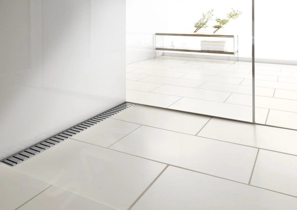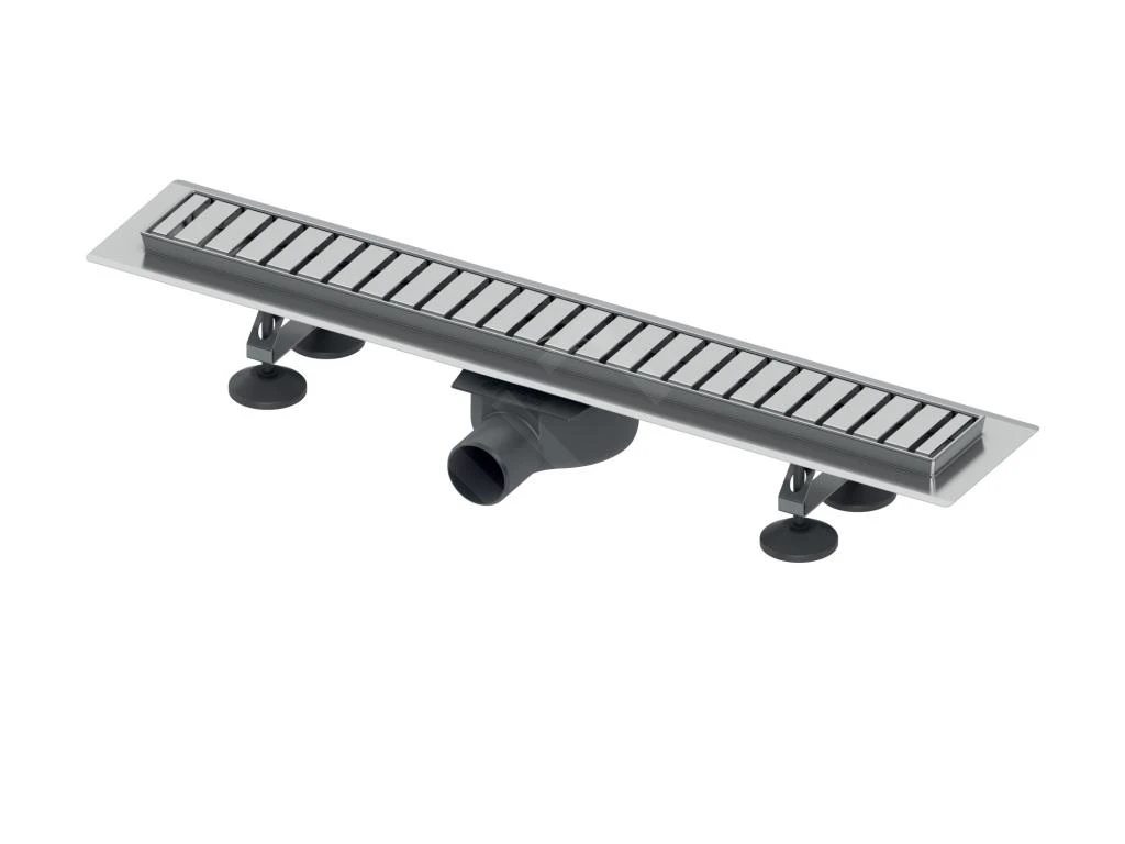 Douchegootset met roestvrij stalen rooster voor inbouw in de dekvloer en aansluiting op de afvoerbuis DN 50. Met flens en afdichtingsmanchet voor aansluiting op de waterdichting.